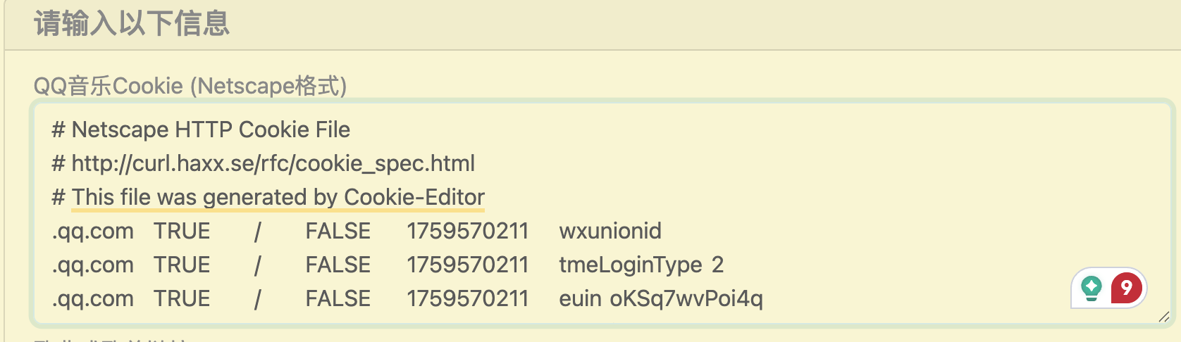 在 "QQ音乐Cookie" 输入框中,粘贴刚才复制的Cookie内容: